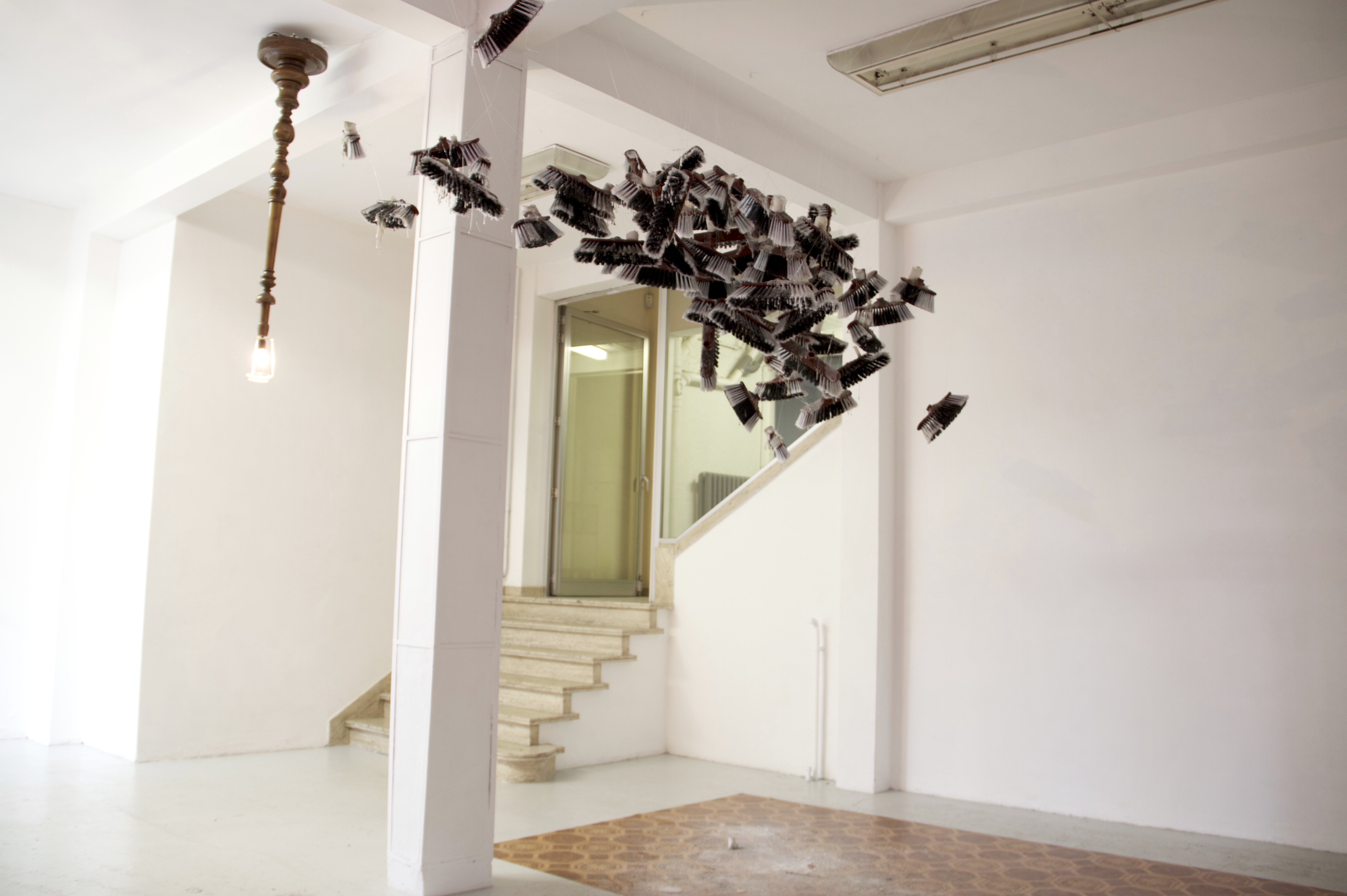 “‘The Batsheva Show’ is the title of the big faceless head cut in three pieces standing in the middle of the space. This was originally made as a backdrop for a TV show the artist was planning to create. This is not the only theatrical element of the exhibition ‘Telling A Mind Stop Being A Mind’. It is conceived as a possible encounter of this head with a new video, a new installation and paintings the artist made a few years ago (2007). The display of the sculptural and pictorial elements on the linoleum floor and painted windows create one more layer of image, colour and patterns that could let the main characters of the show emerge. The main characters are two rabbis portrayed in an oil painting; the artist represented in the big face and the artist in dialogue with her friend Alien Christiaens about meditation in the video. The long dialogue of the video is mute and subtitled. Only the countdown from 100 to 1 is audible at the beginning of the video. The image is a progressive mingling of the two faces through a broken mirror. Is everything symbolic in this show? There is a chandelier made out of brooms hanging from the ceiling, holding candles and drippings of wax. Not far away, a lamp stands without its shade, and the bulb (The bulb will be lit) is hanging upside down. These are the elements of the programmatic scene. The muted voices in the video speak about the possibility and benefit of meditation as a loss of oneself by emptying your mind of any thought. What is a thought? Thinking about thinking? exhibition as a place where you can make the void? Waiting for the visitor, we can not stop thinking about the relationship between the rabbis in the paintings and the women in the video. TV and theatre. Sartre and Godot. The lamp, the linoleum floor and the paintings are old-fashioned. The colours are brownish, Bordeaux, beige, and grey. The Bordeaux paint blocks the windows. I can not stop thinking about a theatre piece by Brecht or Sartre: « huis-clos » is a French word used for theatre pieces that can be translated in English as«meeting in camera » or «meeting behind closed doors ». ‘Huis clos’ is also the title of a theatre piece by Sartre that is translated in English as ‘No Exit’ or ‘No Way Out’. It is a depiction of the afterlife in which three deceased characters are punished by being locked in a room together for eternity and is the source of one of Sartre's most famous and most often misinterpreted quotations, l'enfer, c'est les autres ("Hell is other people").”